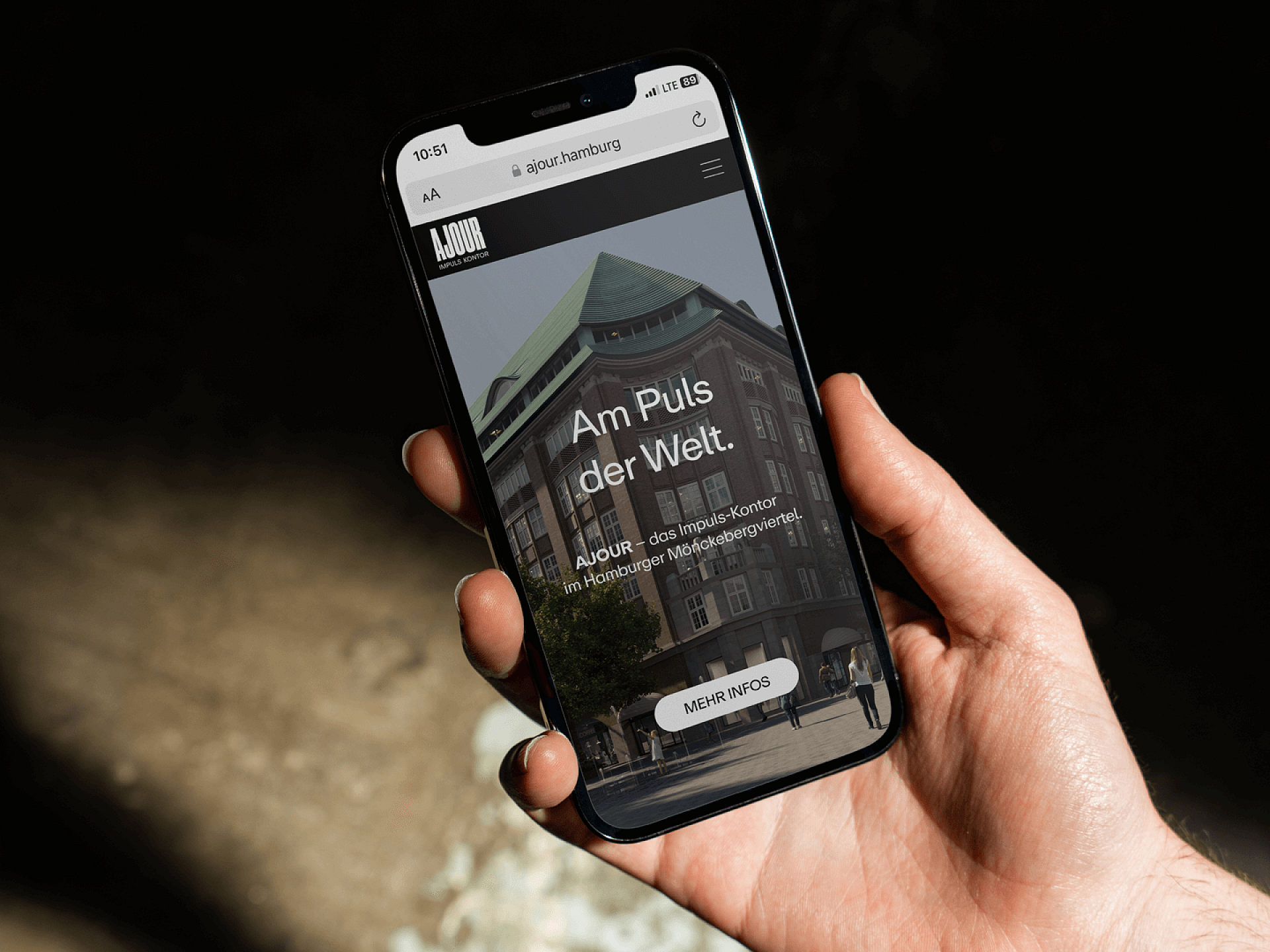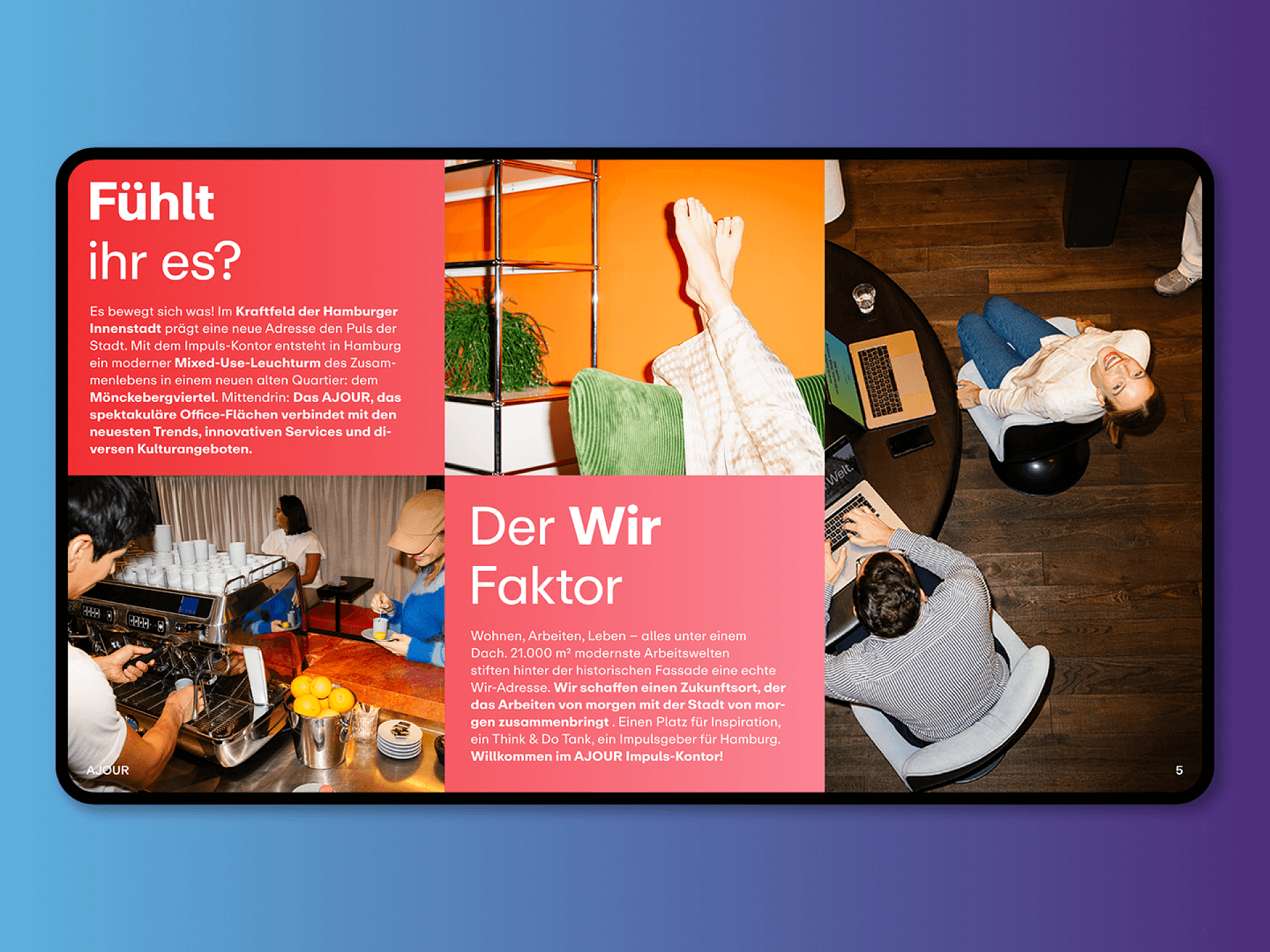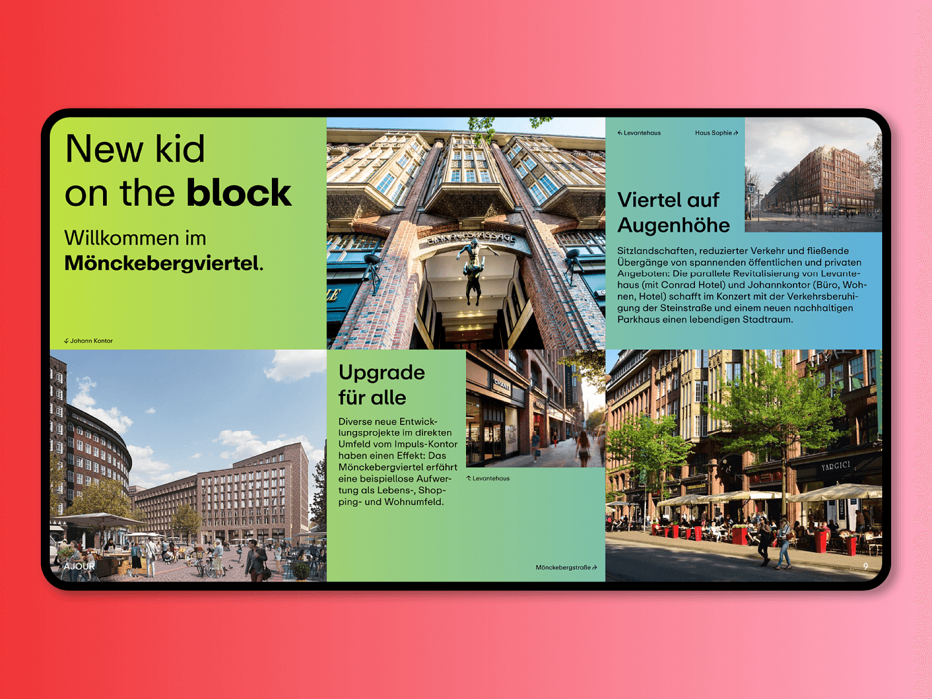 Wir wissen: Genau diese Art von handfester Vision braucht es, um neue Maßstäbe für ein gesundes Stadtwachstum zu setzen. Wir bezeichnen und positionieren das „Ajour“ als Impuls-Kontor und entwickeln eine Corporate Identity mit maximaler Strahlkraft, die der epochemachenden Bedeutung für die Zukunft Hamburgs auf jeder Ebene der Kommunikation gerecht wird – vom Farbkanon auf der Website bis zur Headline in der Teaser-Kampagne.