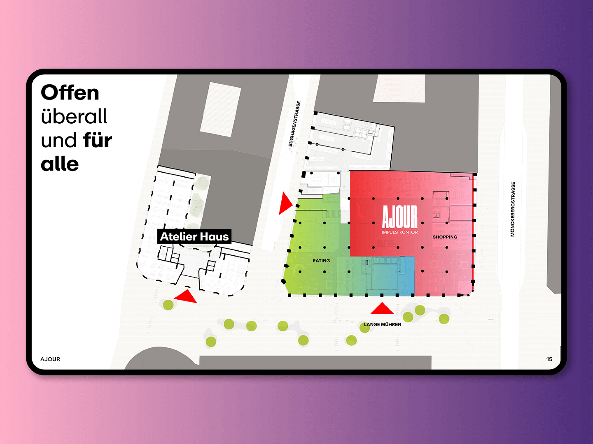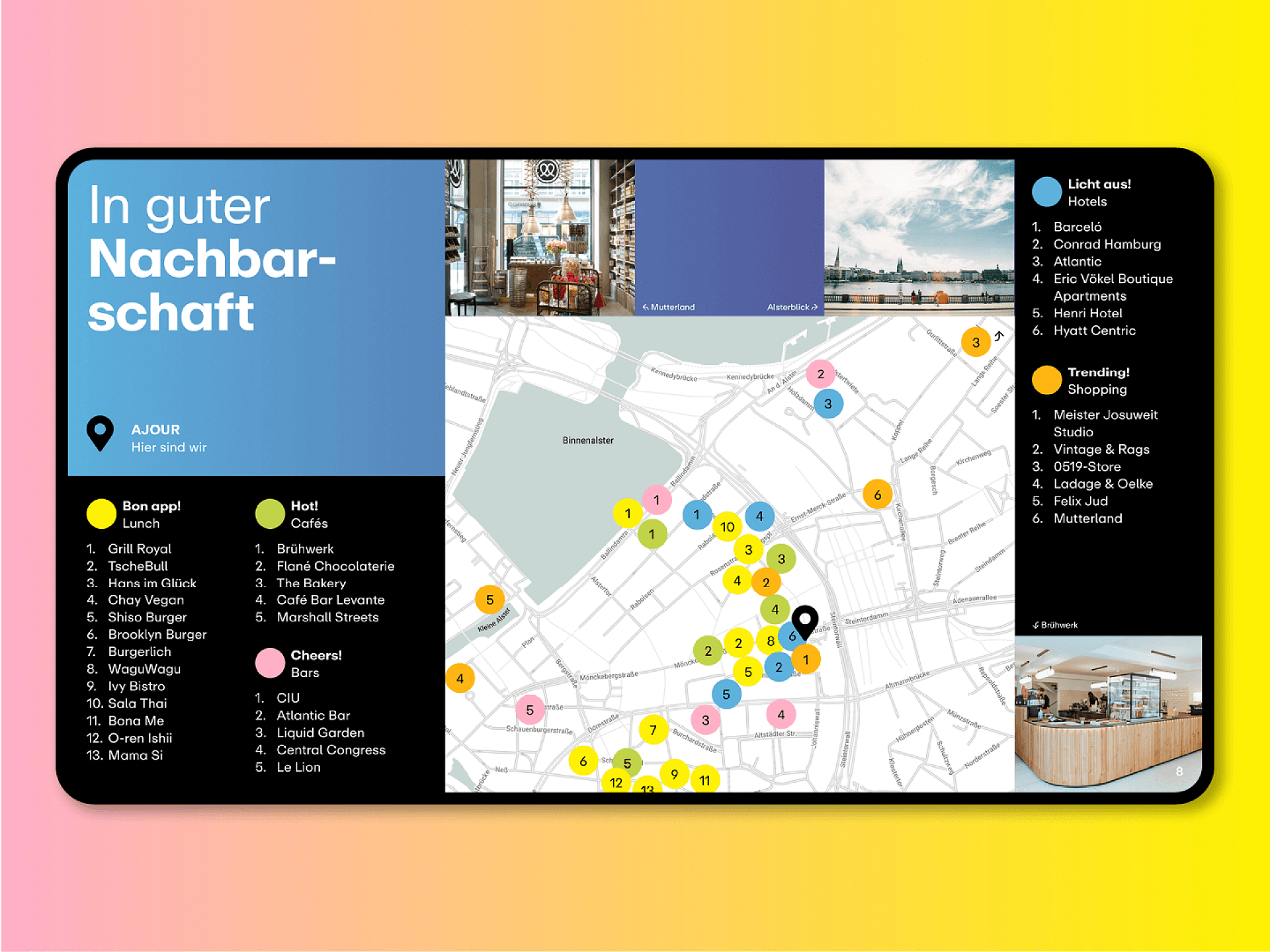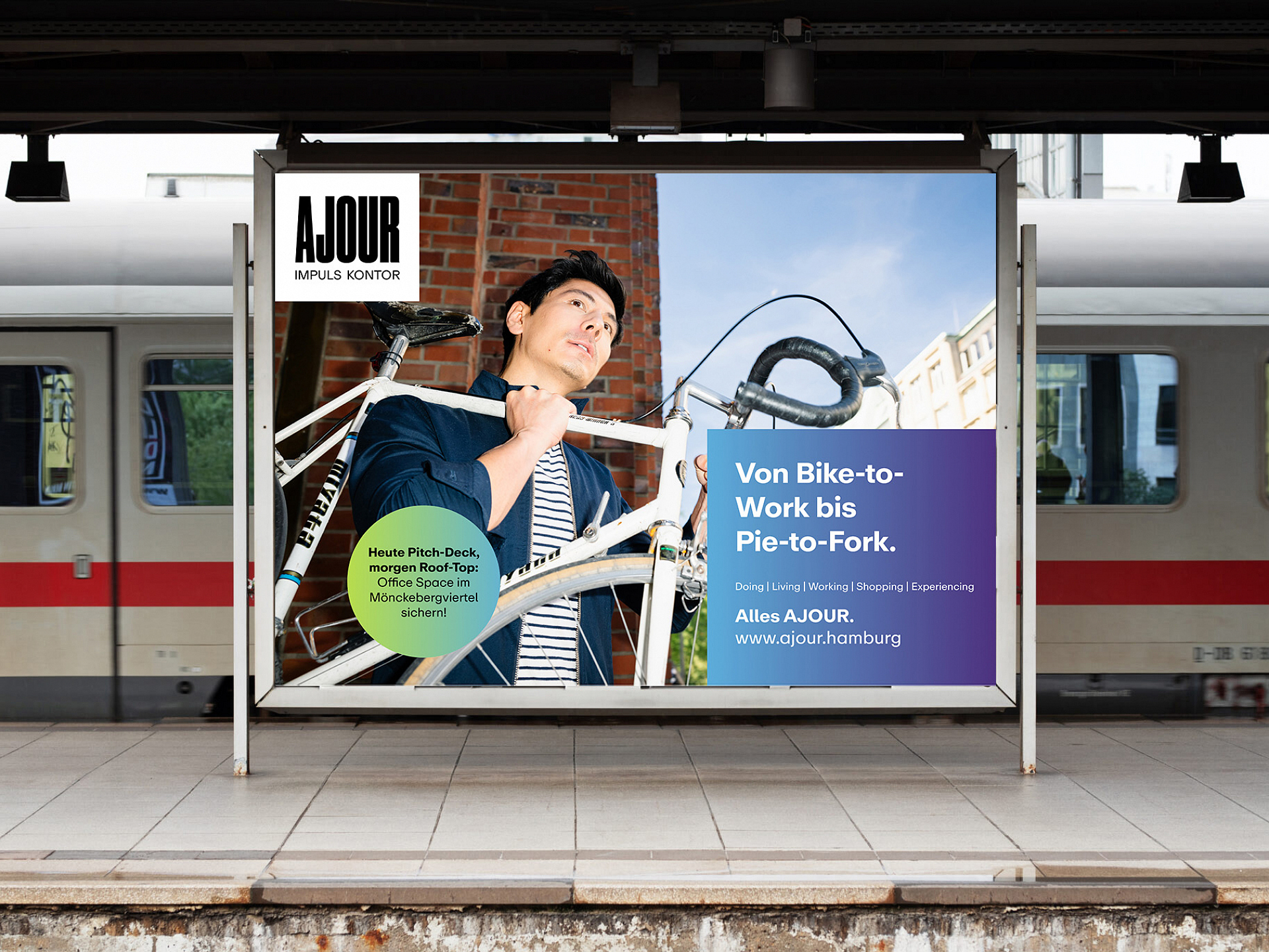 Wir wissen: Genau diese Art von handfester Vision braucht es, um neue Maßstäbe für ein gesundes Stadtwachstum zu setzen. Wir bezeichnen und positionieren das „Ajour“ als Impuls-Kontor und entwickeln eine Corporate Identity mit maximaler Strahlkraft, die der epochemachenden Bedeutung für die Zukunft Hamburgs auf jeder Ebene der Kommunikation gerecht wird – vom Farbkanon auf der Website bis zur Headline in der Teaser-Kampagne.