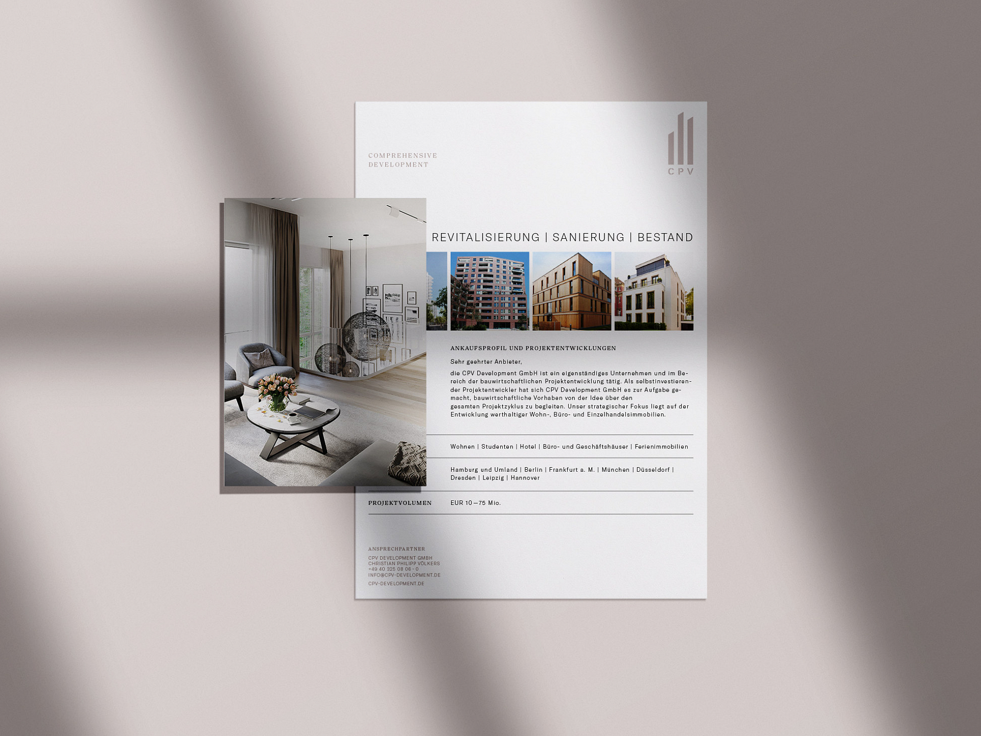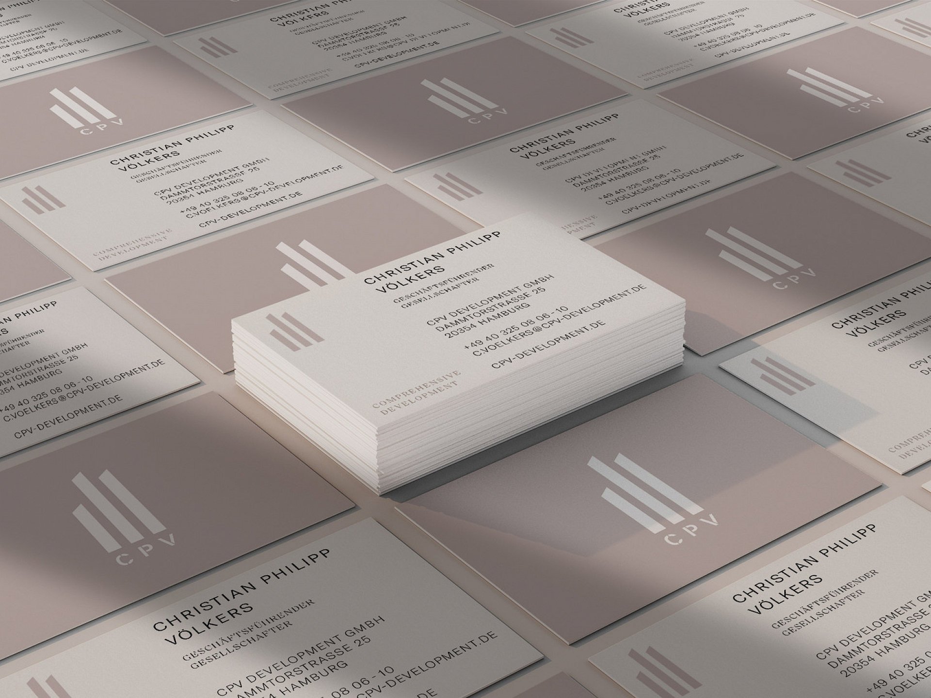 CPV Development wurde 2020 von Christian P. Völkers in Hamburg gegründet. Das Unternehmen versteht sich als ganzheitlicher Projektentwickler mit besonderem Schwerpunkt auf außergewöhnliche Wohnobjekte. Hervorgegangen aus der Projektentwicklungsgesellschaft von Engel & Völkers, erscheint die neue Marke CPV mit dem Claim Comprehensive Development viel zeitgemäßer, moderner und frischer und sorgt so für neue Impulse im heiß umkämpften Markt. Aus der klaren Unternehmensstrategie wurde ein Corporate Design entwickelt, dass sich aufgrund seiner besonderen Ausstrahlung auf den Weg macht, zur unverwechselbaren Marke zu werden.